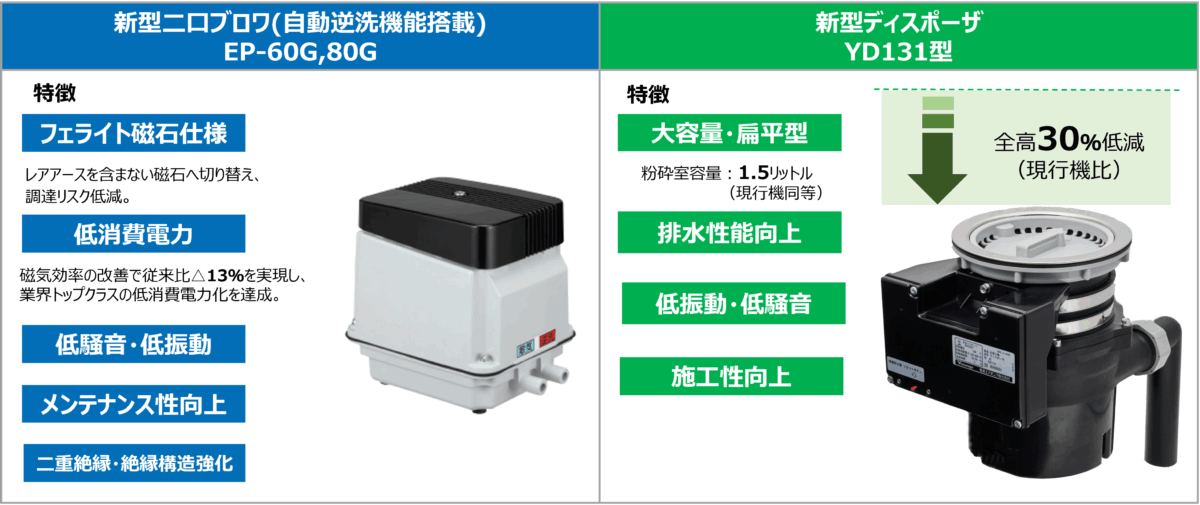 環境機器事業 新型エアーポンプ・ディスポーザ販売開始 2008年に発売開始したロングランモデルである省エネ型二口エアーポンプ、及びディスポーザを市場の変化に対応するため、商品力をより向上させた新モデルを販売開始しました。 Post Share RSS 新規ラインの立上げ状況 前の記事 電極活性化装置拡販 次の記事